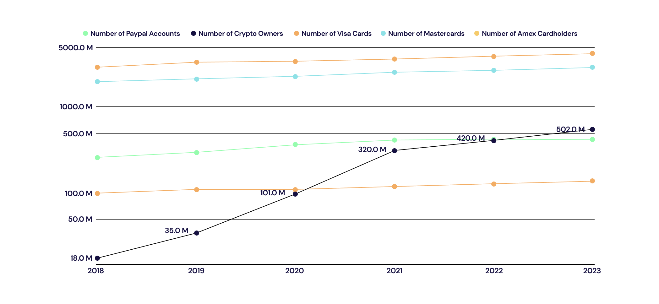 With a compound annual rate (CAGR) of 99% the growth in ownership of cryptocurrencies far exceeds the growth rate of traditional payment methods, which average at 8% from 2018 to 2023. In fact. within the same period, the growth rate for cryptocurrency ownership surpasses that of several payment giants such as American Express.